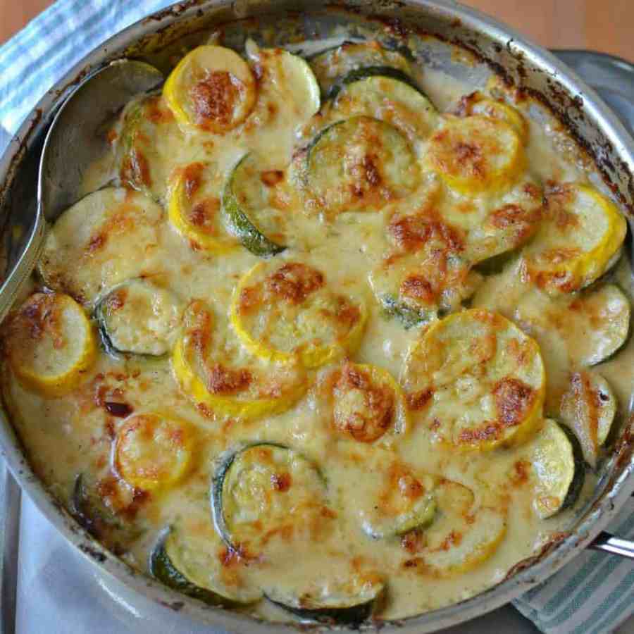 Zucchini Gratin with Yellow Squash is a luscious creamy cheesy medley of zucchini, yellow squash, onions and garlic. It is quick and easy to prepare. It will make a summer squash lover out of you! OK, it’s not quite summer yet but despite the name you may find yellow zucchini in most markets year round. If you cannot find it you can always substitute for winter squash like Butternut or Acorn which is readily available year round. By the way, did you know that zucchini is a summer squash? Yup!