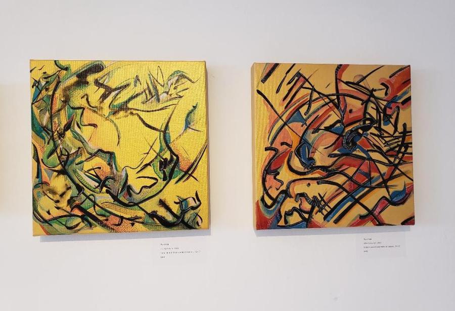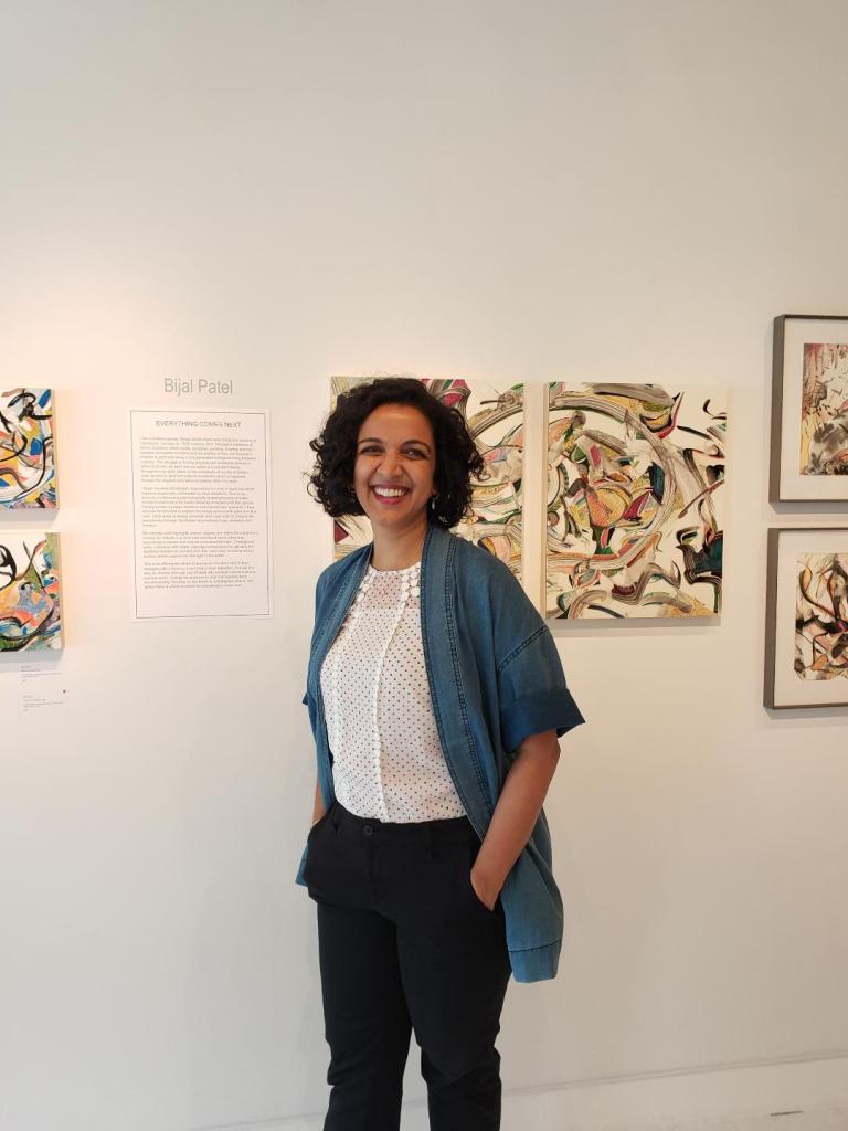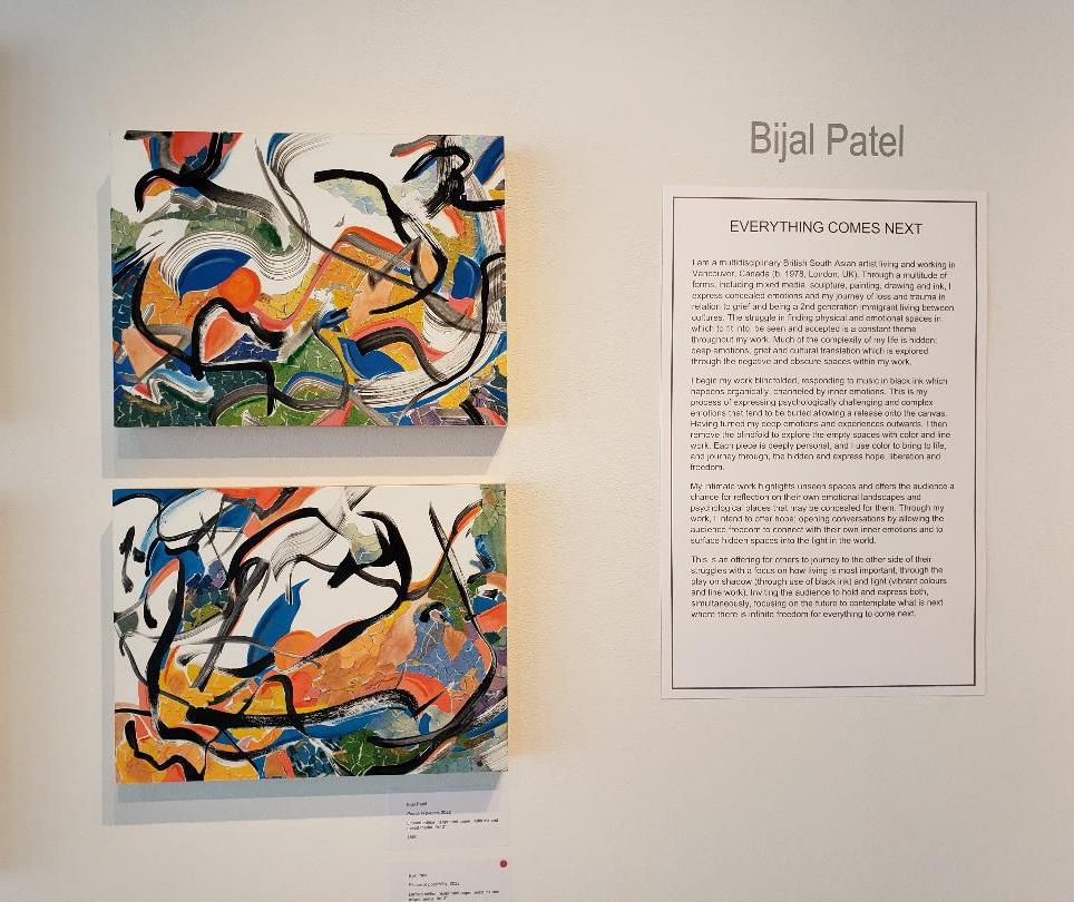 Bijal Patel showcases a personal journey of loss and trauma through mixed media art where she begins to work blindfolded, responding to music in black ink channeled by inner emotions. It results in a complex and hauntingly beautiful display of inner reflection, that once blindfold is removed she then turns empty spaces into color and line work. An extraordinary play on shadow and light.