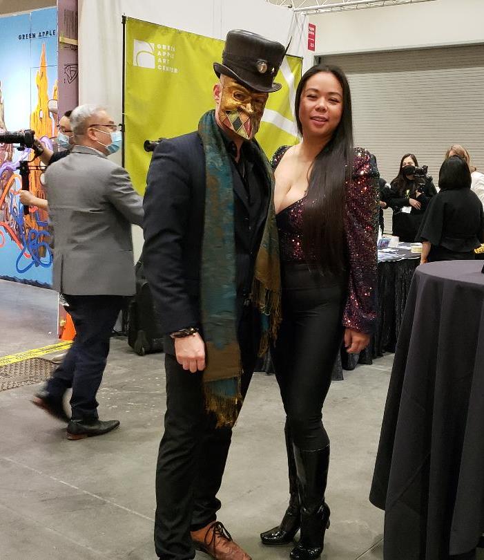 Marc Hazel (in mask) with Quynh Nguyen in artistic dress.Erik Markovs, Portland, USA. Using vintage wallpaper and other materials to create unique and beautiful mosaic wall art.