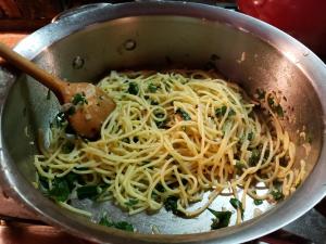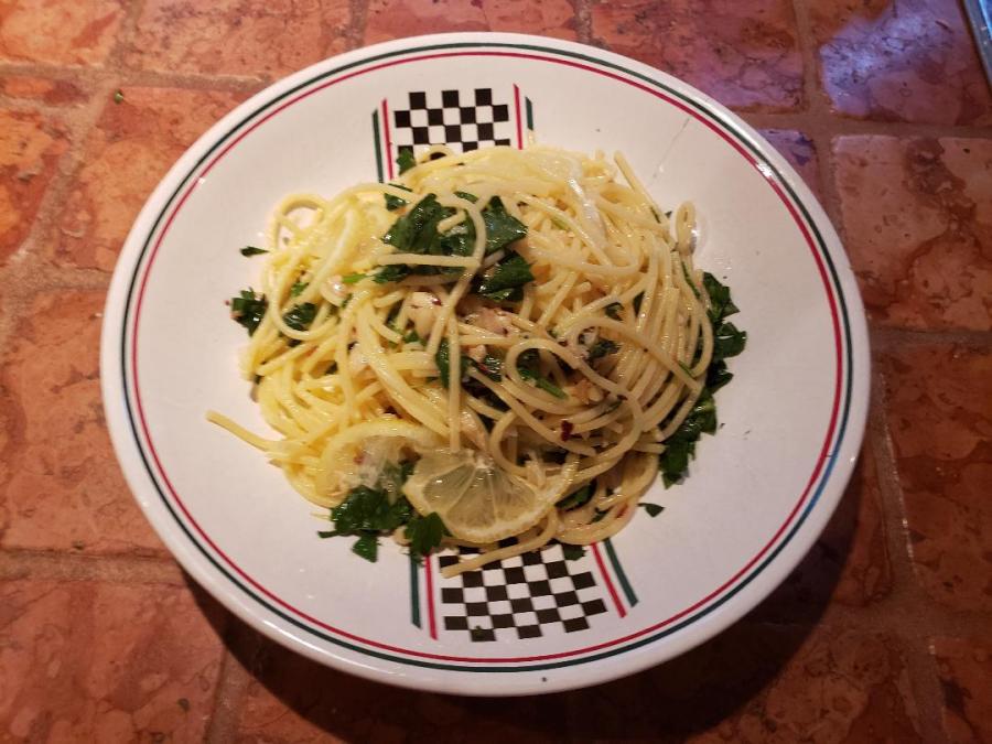 For this dish you need only spaghetti, fresh lemon (sprinkle some zest over top at the end), a few garlic cloves minced, chopped fresh parsley, olive oil, a little butter, parmesan cheese, cracked black pepper and course salt.
