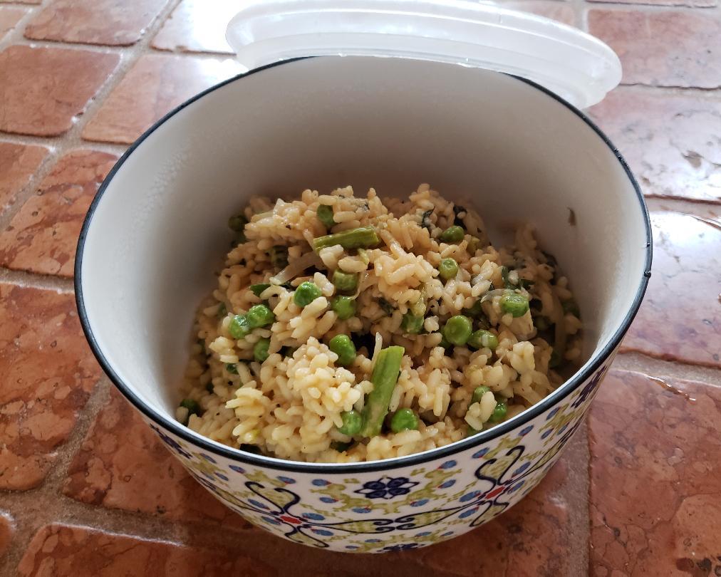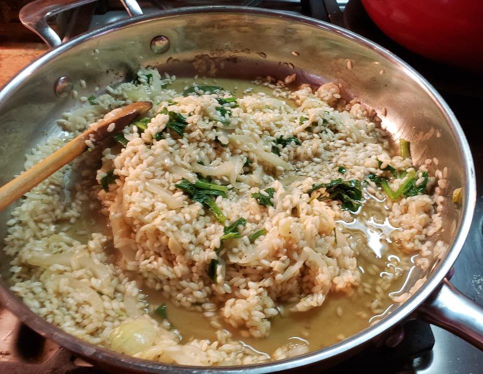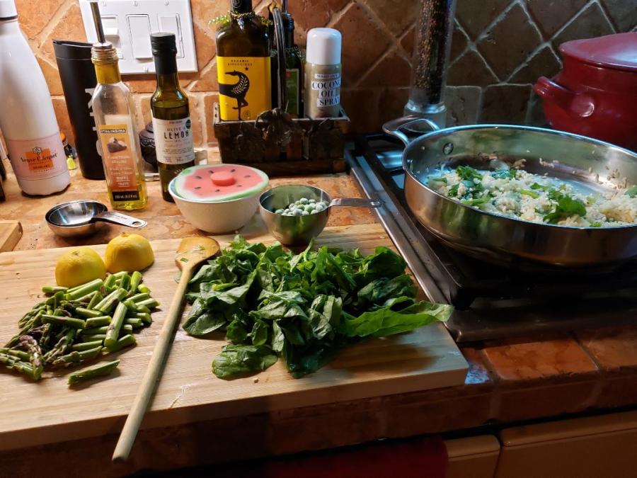 Add the spinach and asparagus and cook until the spinach is wilted. Add the frozen peas and cook just until the vegetables are hot. Stir in the Parmesan and more broth if the risotto seems too thick.