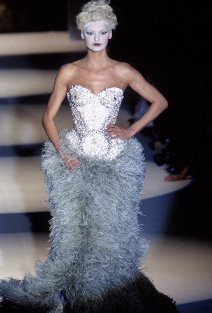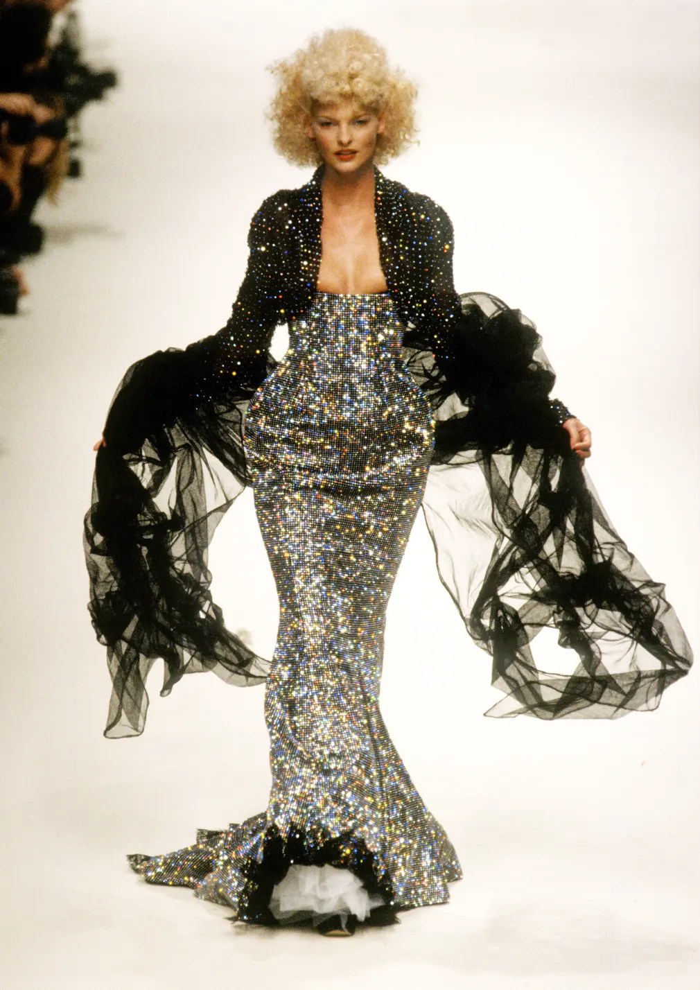 Spring/summer 1995, Paris Supermodel Linda Evangelista in a dazzling gown on the runway. Photograph: Images Press/Getty Images