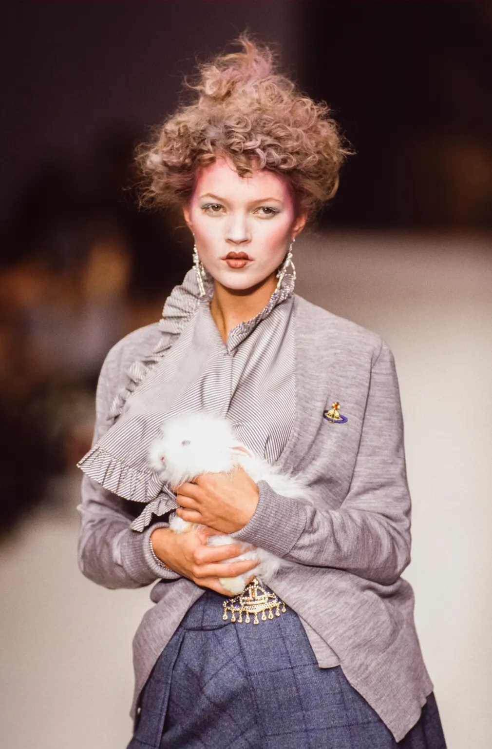 Autumn/winter 1995-96, Paris When asked about her most memorable Westwood show by Another Mag, Kate Moss said: “The one where I had a rabbit and I think I was naked … I don’t think they’d put any top on me. I don’t know, I was wearing Crotch Minis [dropped crotch trousers] and I think some crazy hairdo by Sam McKnight – a mohawk but it was all curly …” Photograph: Daniel Simon/Gamma-Rapho/Getty Images
