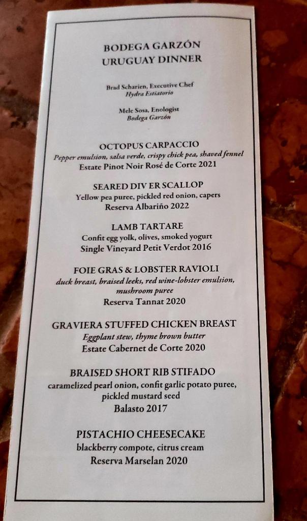 One of the wines is called Balasto – a 2017 iconic red wine made from Tannat (the national red grape), Cabernet Franc, Merlot, Petit Verdot grapes. This big, beautiful bold wine was paired with braised short rib stifado (which was a tasty dish of short rib with caramelized pearl onion, confit garlic potato puree + pickled mustard seed). As you can guess, it was wonderful. And the whole evening was like one big food and wine fest of its’ very own.