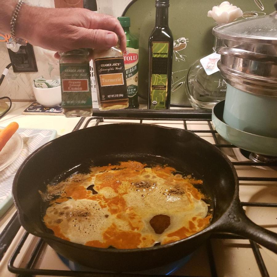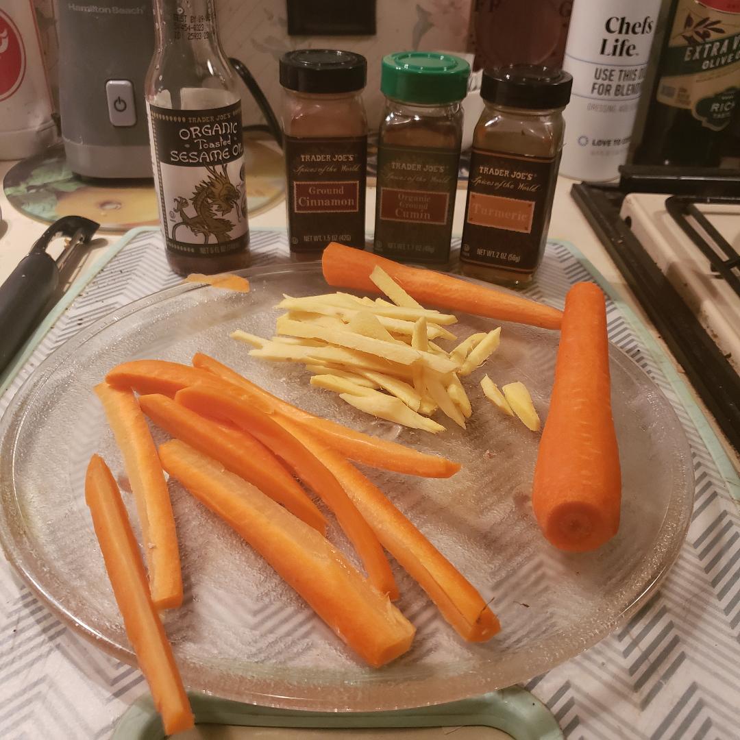 Two carrots, one mesh packet of ginger, 4 Tbsp of toasted sesame oil, for spices use 1 ½ teaspoons each of dried turmeric + ground cumin.