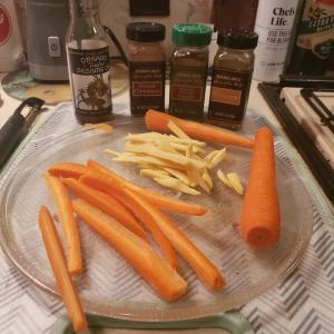Preparing the sliced ginger and carrots (thin + lengthwise)