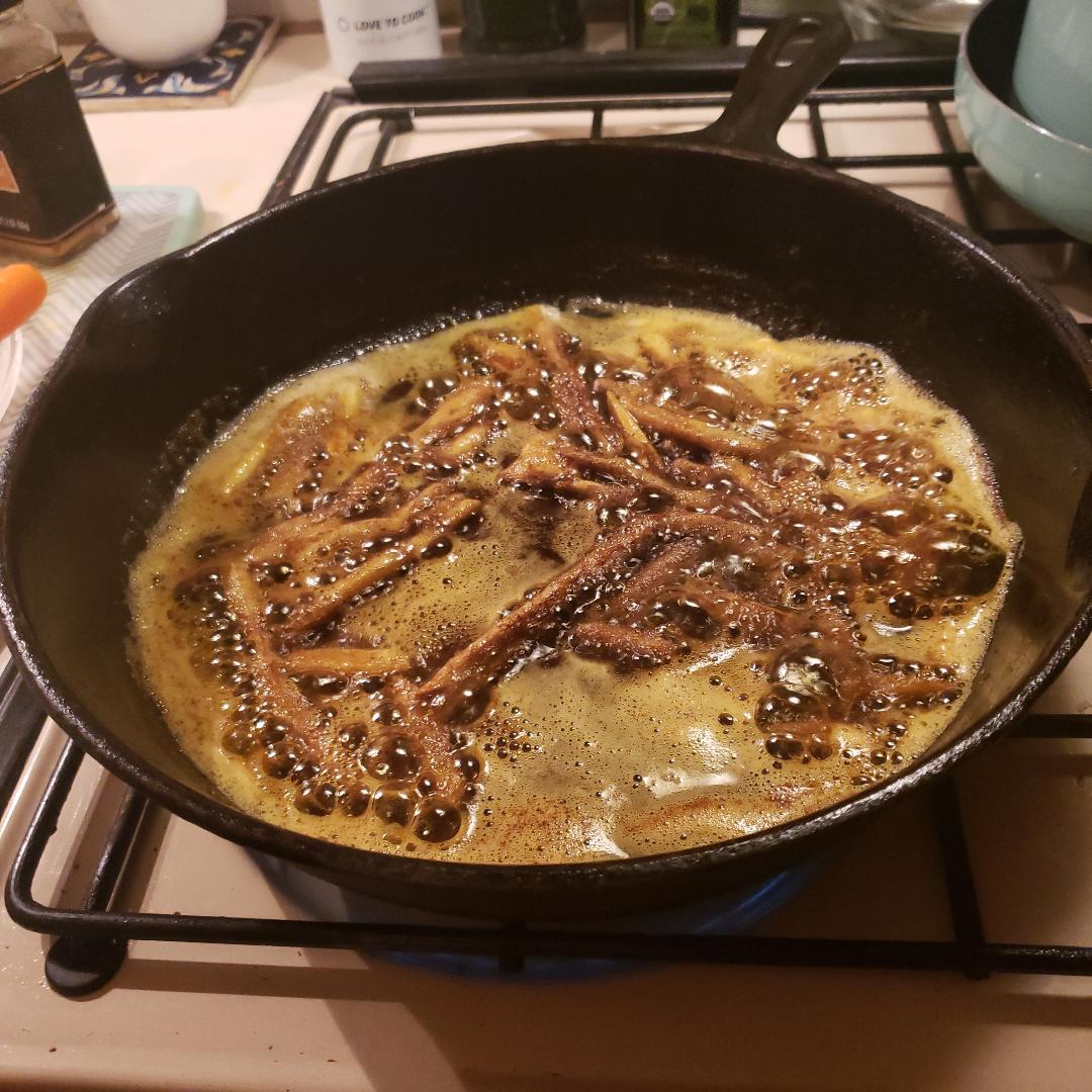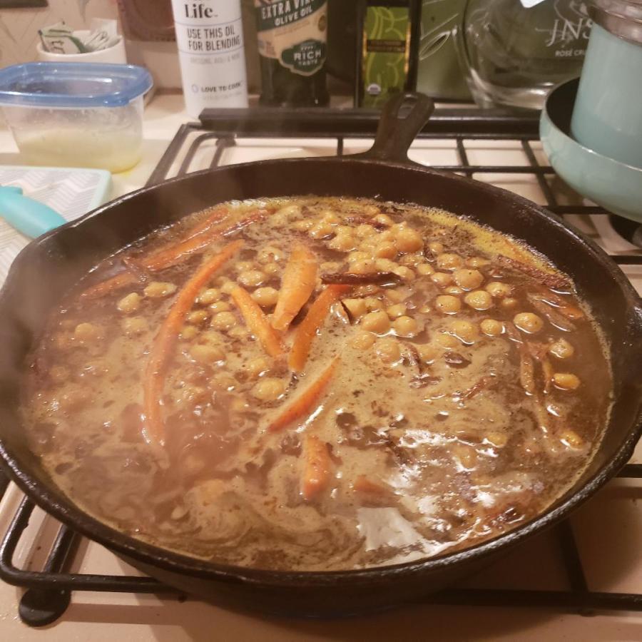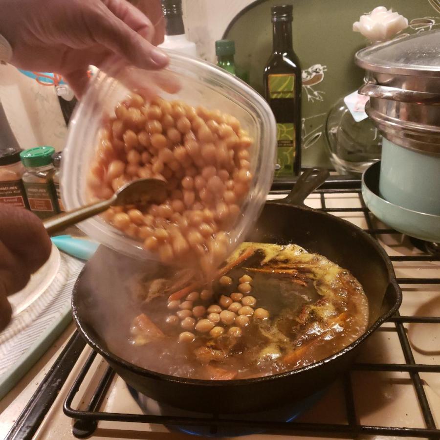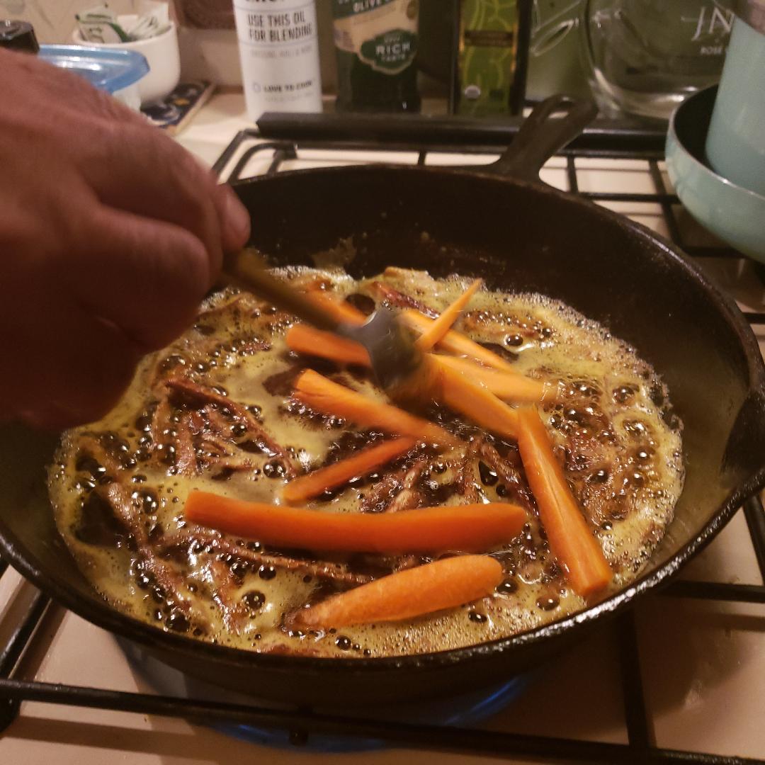 Get the oil hot then fry the spices in the oil first for a few minutes then fry the sliced ginger strips until they get a bit crispy – about 5 minutes. Then add half of the sliced carrots. Cook a few minutes more, then add the chickpeas with soak water.