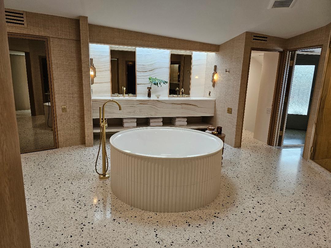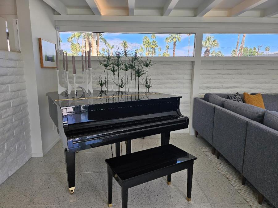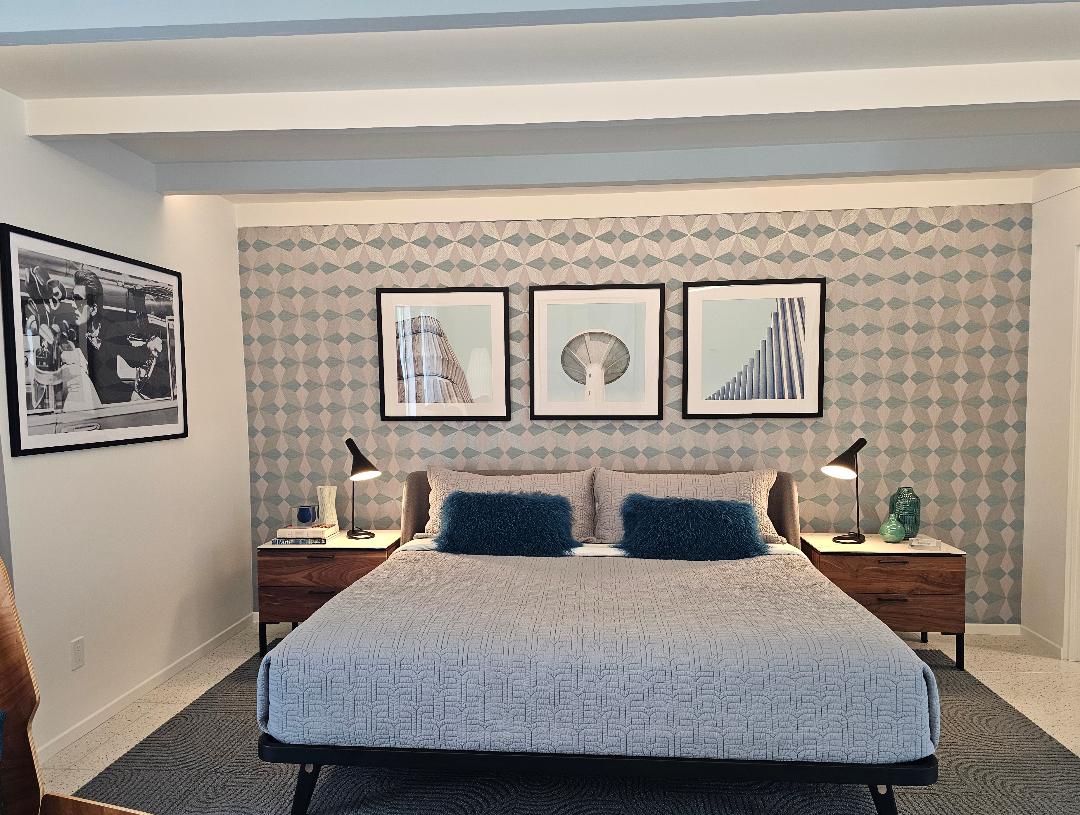 Celebrating the home’s elongated flat roof with walls of glass, they delightfully blurred the boundaries between interior and exterior spaces, drawing the eye to the historic slump stone walls and wonderful pool area. The outside area exemplifies desert living and the mid-century modern experience. This home is a model of thoughtful architectural preservation enlivened by the best in modern design. It received a well deserved historic designation in 2022.