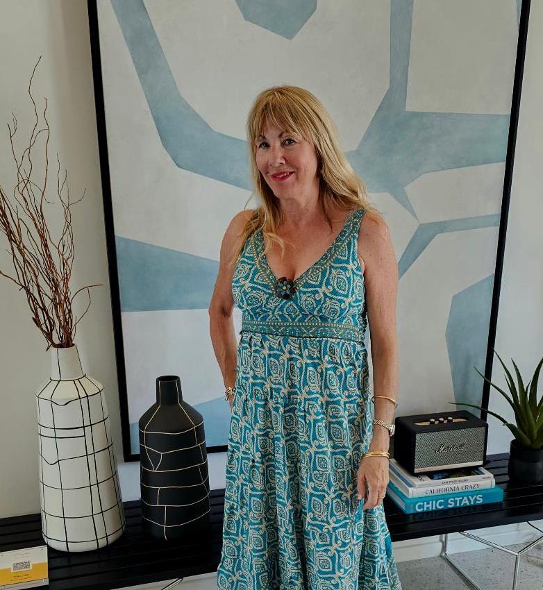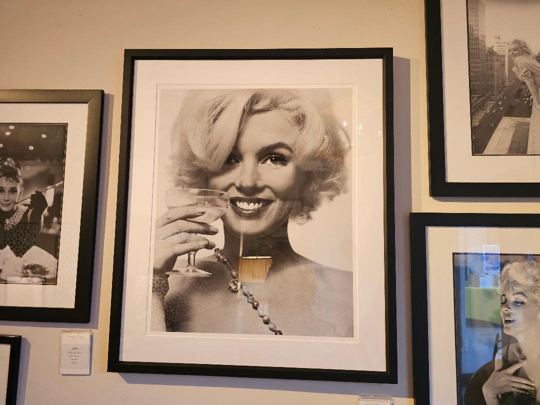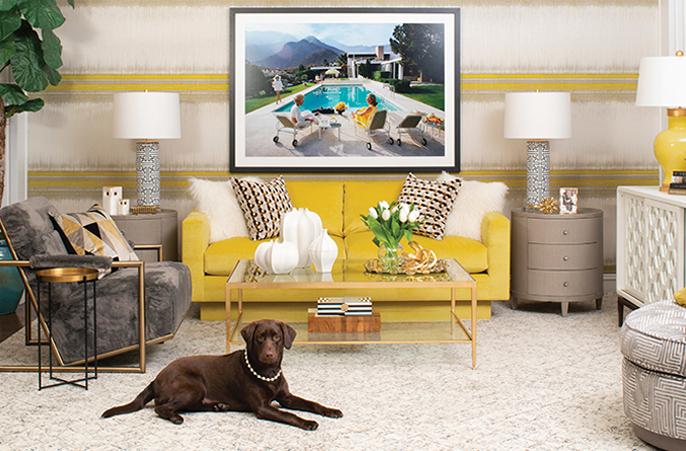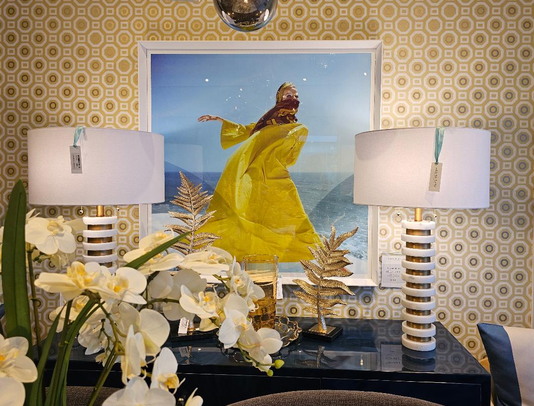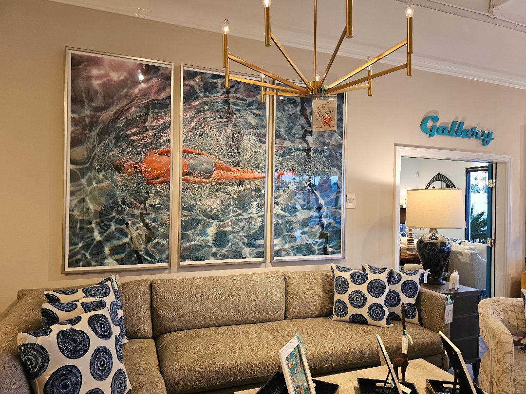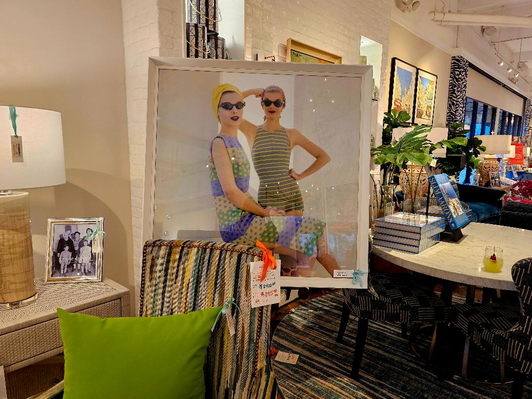 Grace on the floor by a “PoolSide Gossip” print on the wall at Grace Home Furnishings . Photo: taken from their website.