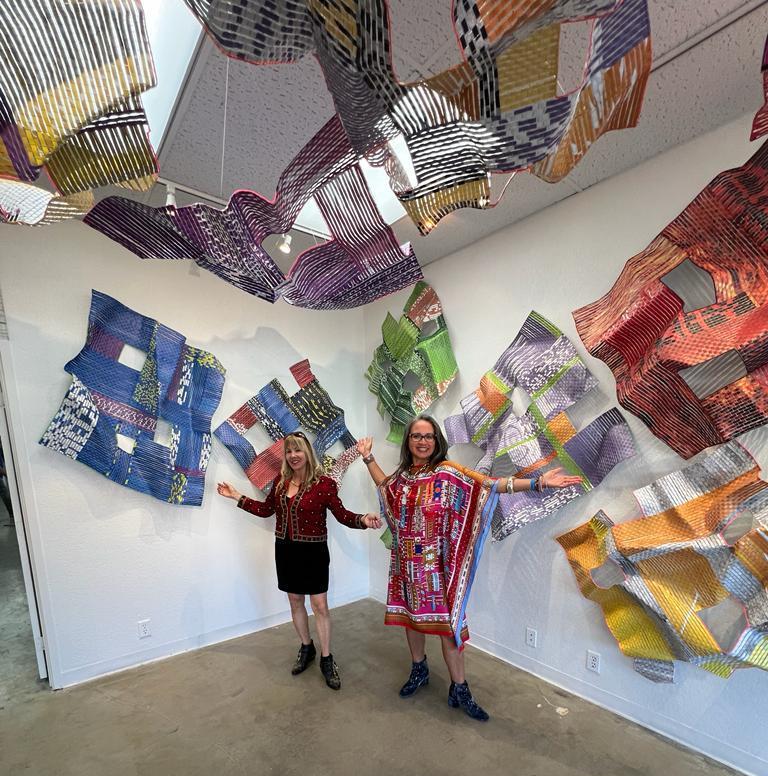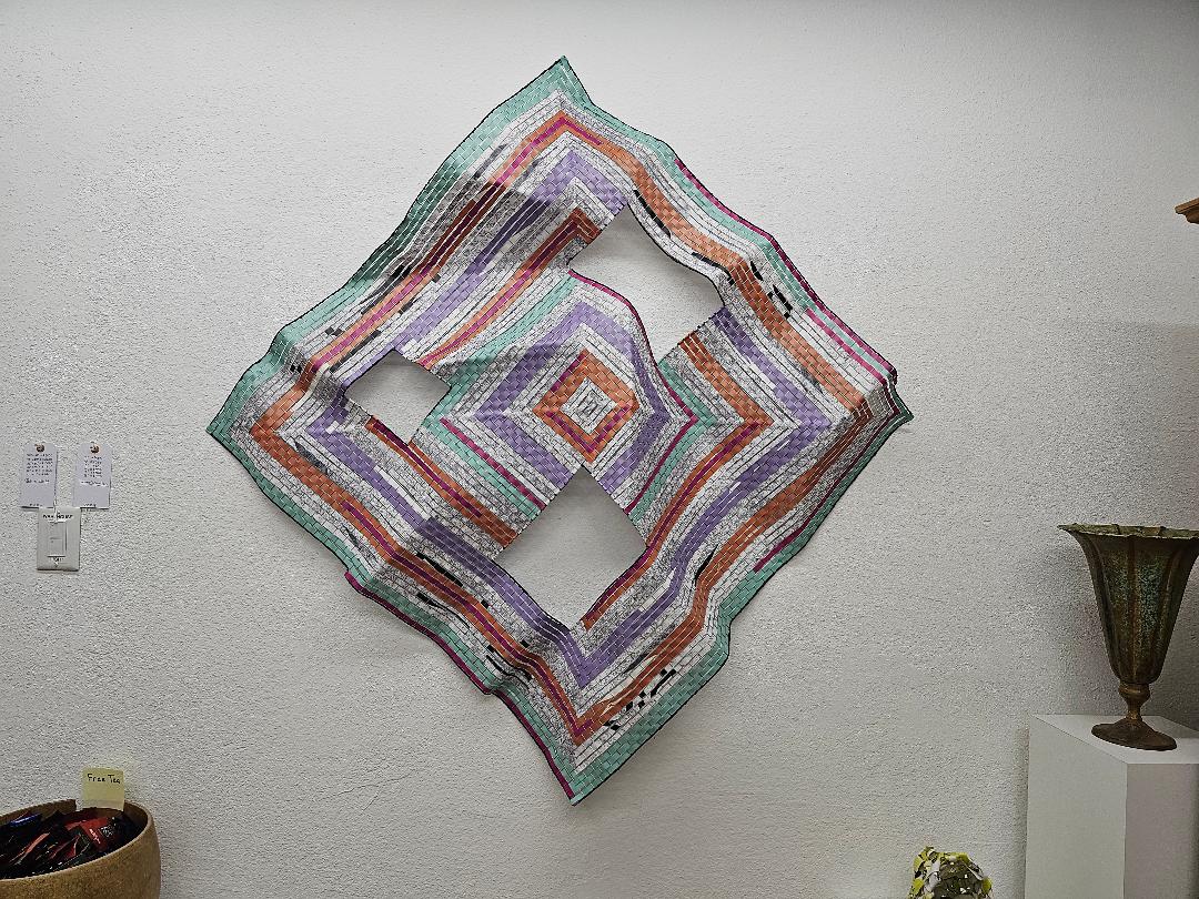 Her contemporary art studio contains sustainable art. Shelley is deeply committed to raising awareness about the environment through her unique art form –which is collecting discarded advertising banners and turning them into captivating works of art that can withstand all weather. Through meticulous hand cutting techniques, she fractures the initial image and repurposes it into beautiful weavings, collages, or three-dimensional sculptures that bear little or no resemblance to the original.