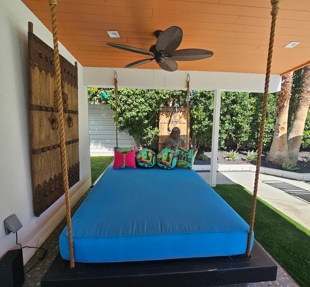 The front entry has been expanded and the original breezeway has been converted into a swank party lounge. Beyond the lounge, the addition of a casita offers a quiet retreat with a unique vantage point of the pool’s and surrounding areas.