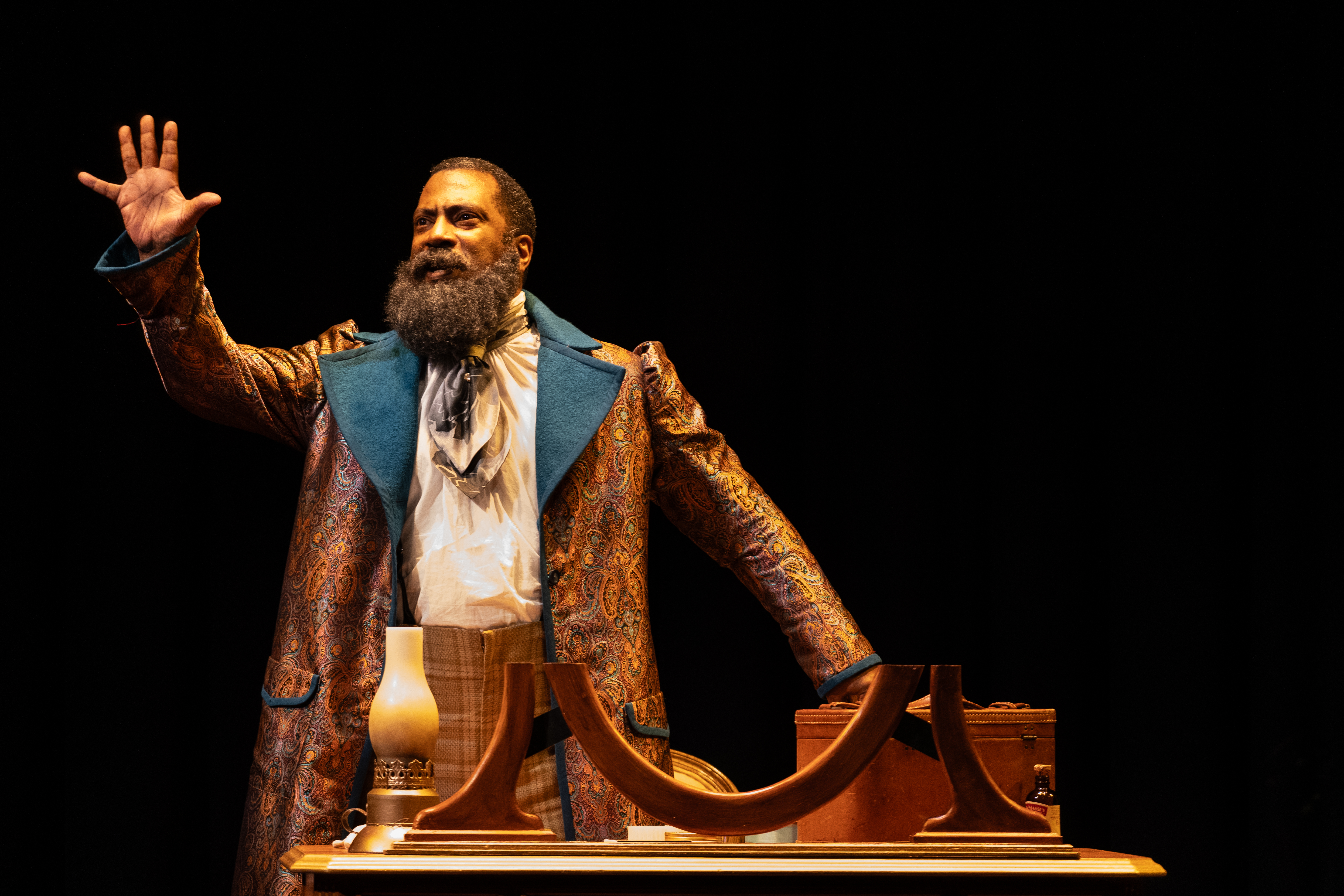 The intense play opens up later in Aldridge’s life, in Poland before he takes the stage in a different show. His room is invaded in his absence by a young, inexperienced and ambitious female reporter for a local paper, enabled by one of the hotel’s servants. For the first several minutes of the play we get to watch these two frolic around the stage speaking German, and for some reason we are not treated to a translation of what they’re saying. However, the rest of the show is done in English.