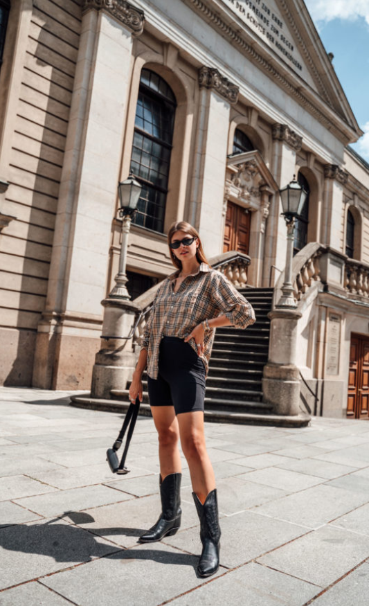 This sporty combination is perfect for a casual yet trendy outing. Pair an oversized shirt with fitted cycling shorts for a balanced look. Opt for a sweater in bold colors or patterns to make a statement, and add chunky sneakers for comfort.