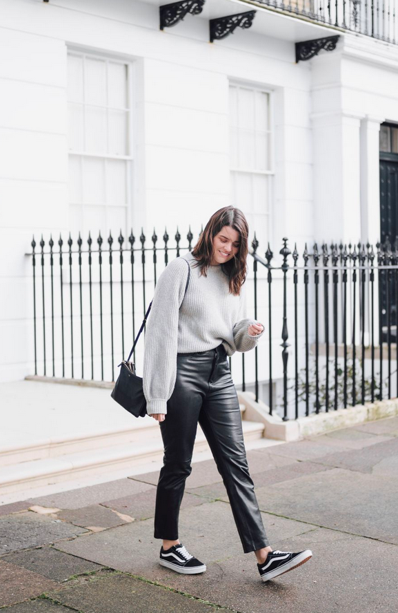 Pairing a crisp light gray sweatshirt with sleek leather pants creates a stylish blend of casual and edgy. Opt for a sweatshirt with subtle embellishments, like embroidery or textured fabric, to add depth and interest to the look. Tuck in the sweatshirt slightly for a polished yet relaxed vibe.