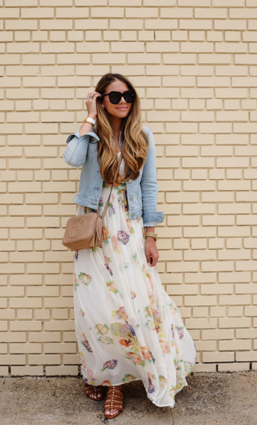 A floral maxi dress is such an outfit that can flow smoothly from day to night. Carry a flowing maxi with natural beauty and style, pair it with sandals for casual outings, heels for evening events, a jacket, etc. Add a denim jacket for warmth and structure, especially on cooler nights.