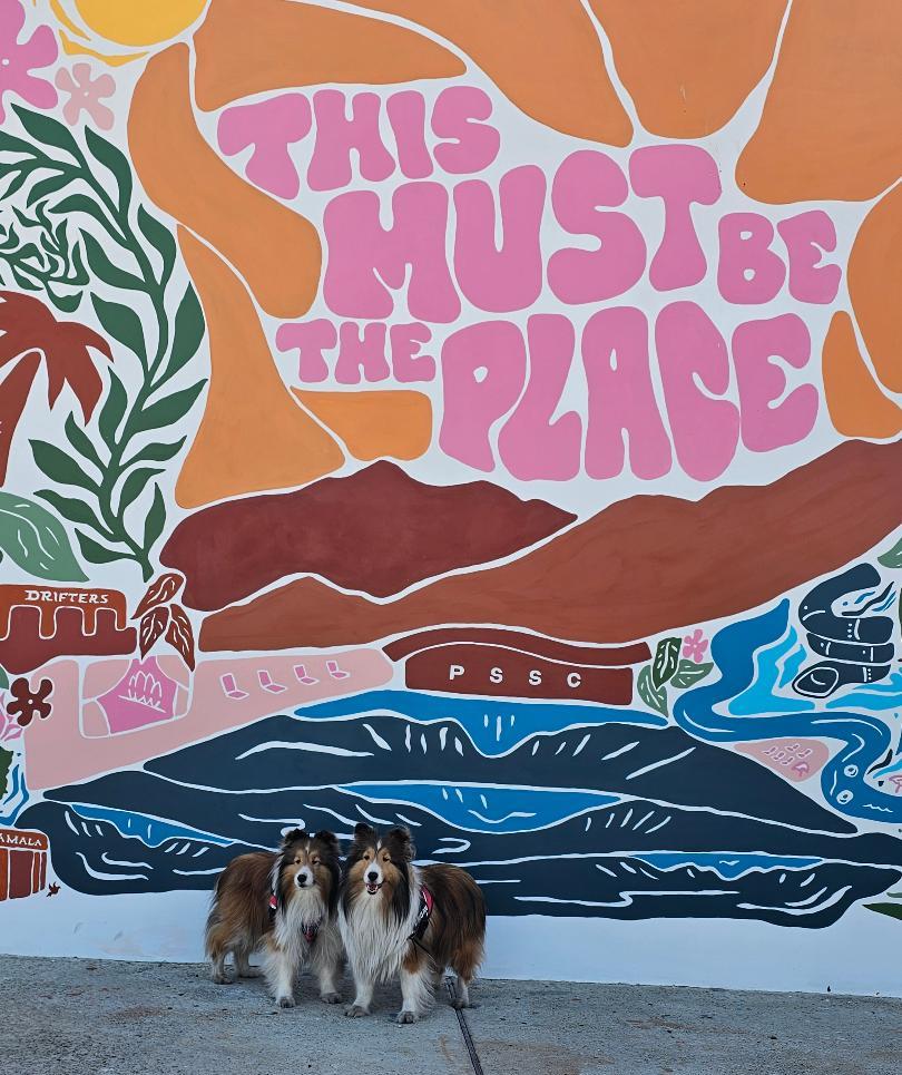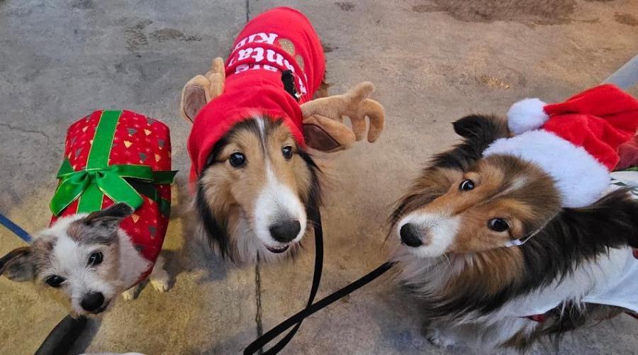 With Brenda, Erika + Mini.Holiday Yappy Hour at Boozehounds (Mia, Adele + Layla). Adele’s sweater says “I ate all of Santa’s Cookies” – very appropriate for her. Layla’s dress has a tulle skirt that says “Santa Baby.” Both from PetCo. Mia’s presence is a present in itself.