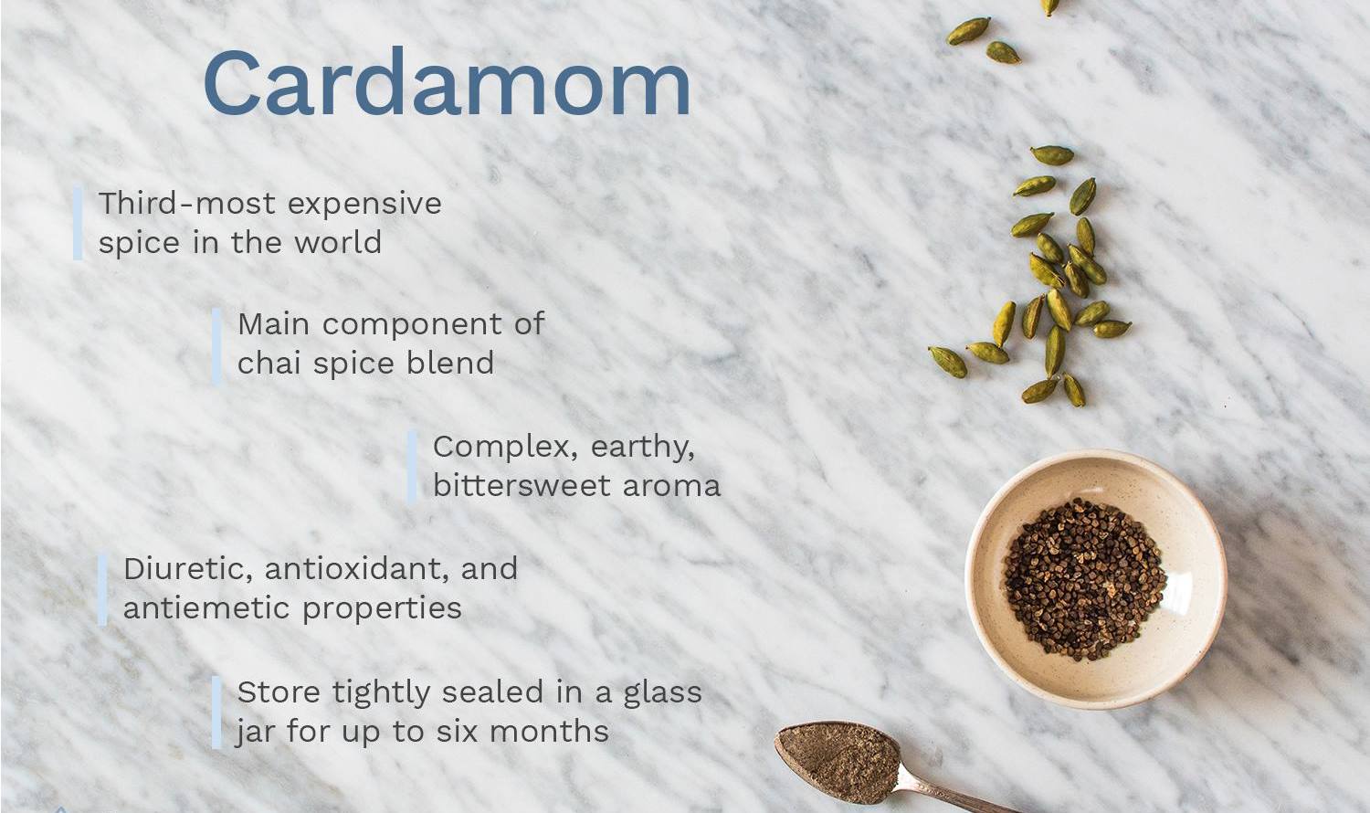 *Cardamom is a spice made from the seed pods of various plants in the ginger family. Cardamom pods are spindle-shaped and have a triangular cross-section. The pods contain a number of seeds, but the entire cardamom pod can be used whole or ground. The seeds are small and black, while the pods differ in color and size by species.