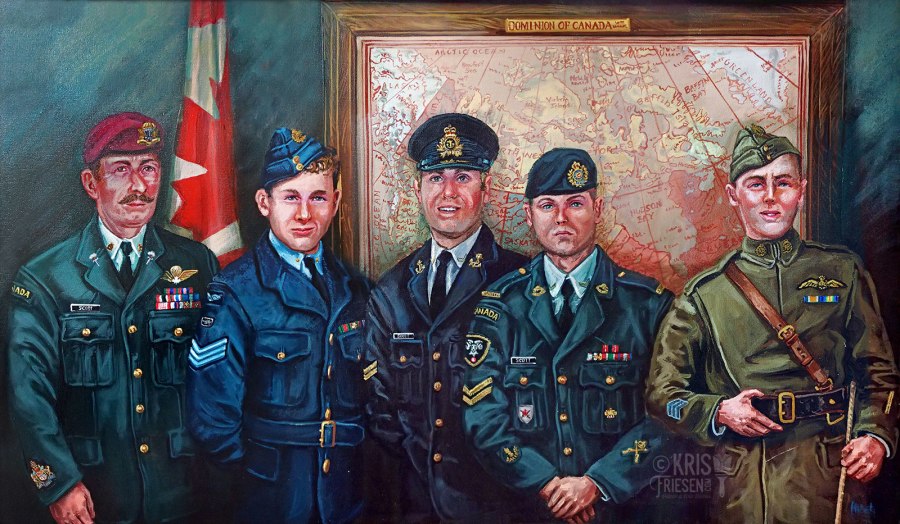 This group portrait painting depicts four generations Canadian military service with five members of the Scott family, from the Royal Canadian Air Force in World War 1 to Combat Engineers in Afghanistan. Where the oldest generation did not meet the youngest, and a photograph would be impossible, all are painted shoulder to shoulder in this portrait – Kris Friesen.