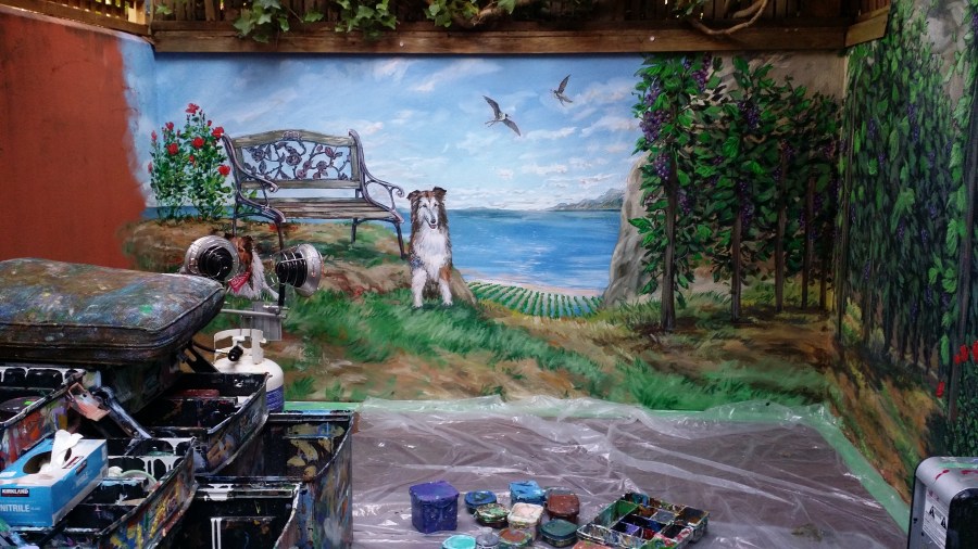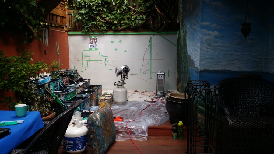 However by then Kris had unfortunately for us, moved to Edmonton and we dressed up the blank wall with a wall hanging and later on a mirror with plants in front. We felt it needed something. Fast forward to this past summer when I found Kris’s website and sent him an e-mail not even sure he’d remember me. Surprisingly he did. By this time he had moved to Duncan, B.C. – at least it was a lot closer. I told him my husband had passed away and that we had been talking for years about wanting to get him back to do some more art. Luckily for me, Kris was Vancouver bound for several days just recently so we discussed the wall. I thought Spring would be a perfect time to start however Kris was going traveling for a while and not sure exactly when he’d be back. Since the weather was good and considering how well the other mural held up over the years, I decided to go ahead.