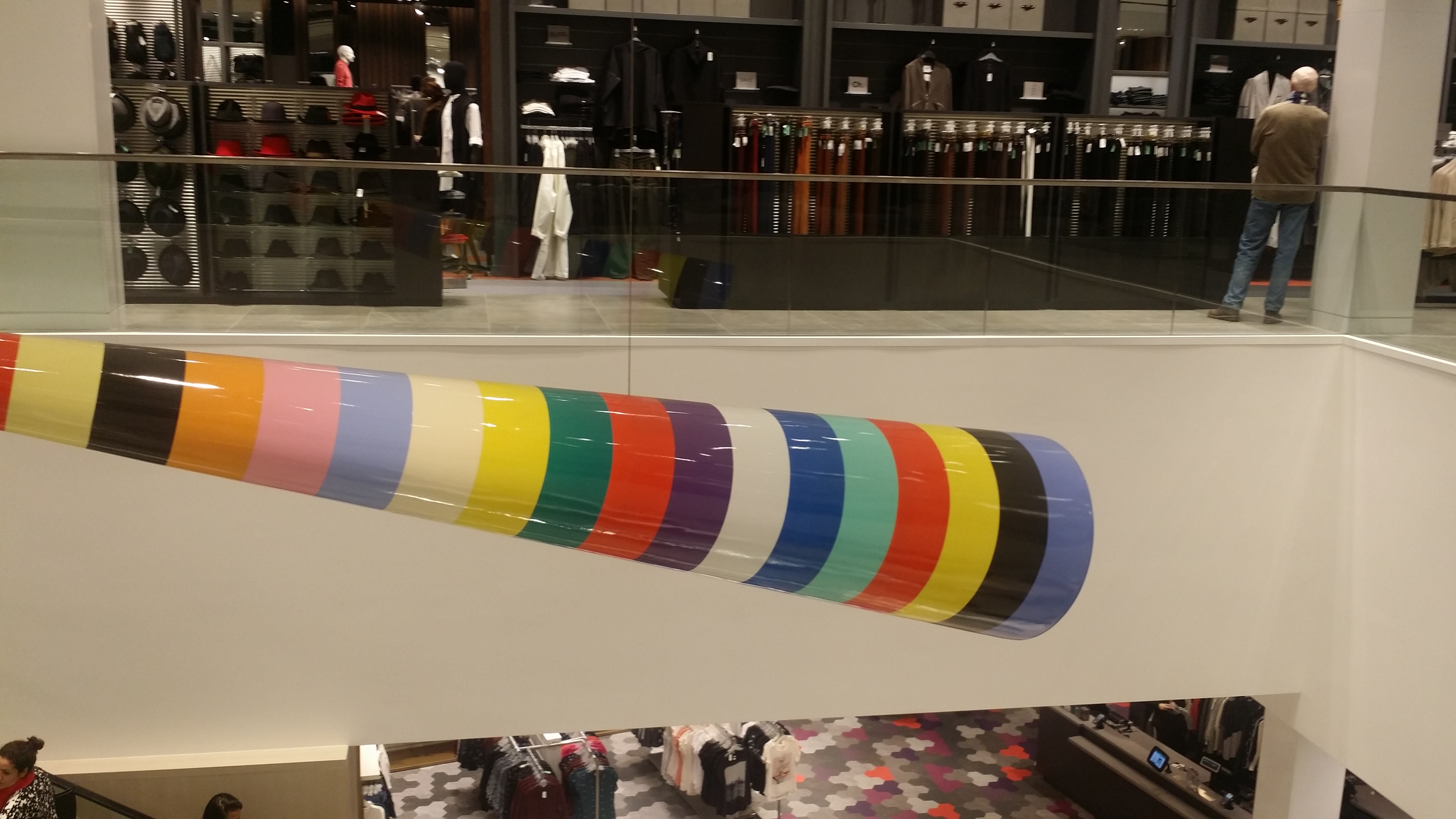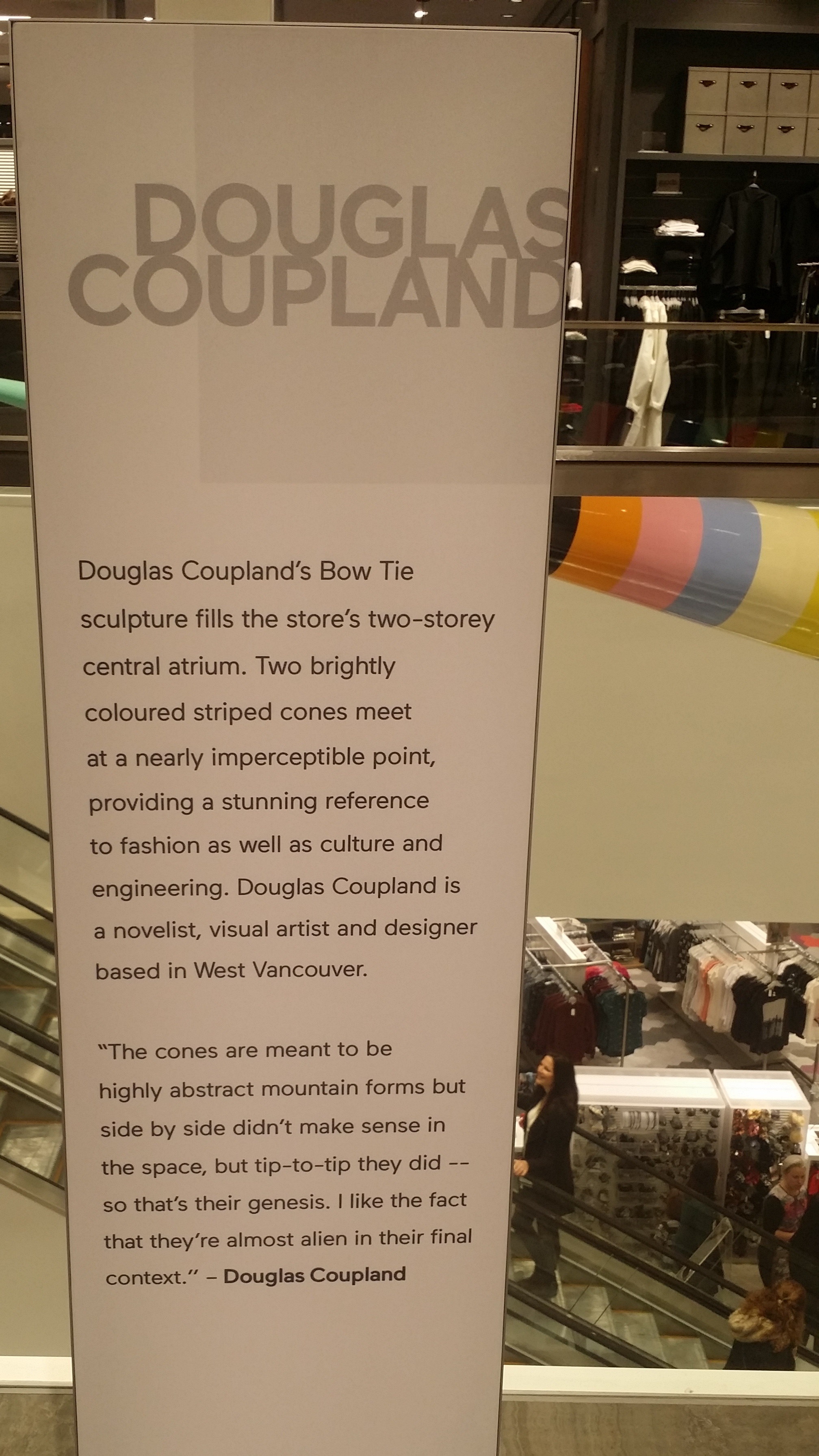But that was then. The scene is definitely changing and has changed significantly (for the better) since I moved here. Aside from all the independent little boutiques situated all over this city (with an emphasis on Main St. & in Gastown), we have recently acquired two brand new department stores with the upscale U.S. chain Nordstrom downtown and another called Simons in West Vancouver. Simons is a much smaller operation owned by a Quebec City family that has been around for more than 175 years. It is their second location outside of Quebec, after Edmonton. While Nordstrom is definitely the more swanky of the two, Simons (located at Park Royal South) can boast local artwork and some artful lighting. The showstopper is a piece by Douglas Coupland that hangs above the atrium in the shape of a bow tie. Both department stores have in store restaurants and a few fashion lines new to this city.