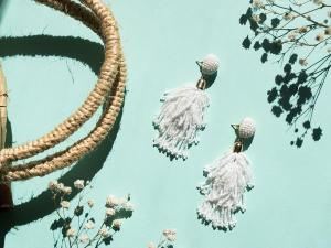 Spice up any summer look with these 3″ length statement earrings in brilliant white. Perfect for virtual happy hours with friends. Made in India of white iridescent glass beads and silk thread.