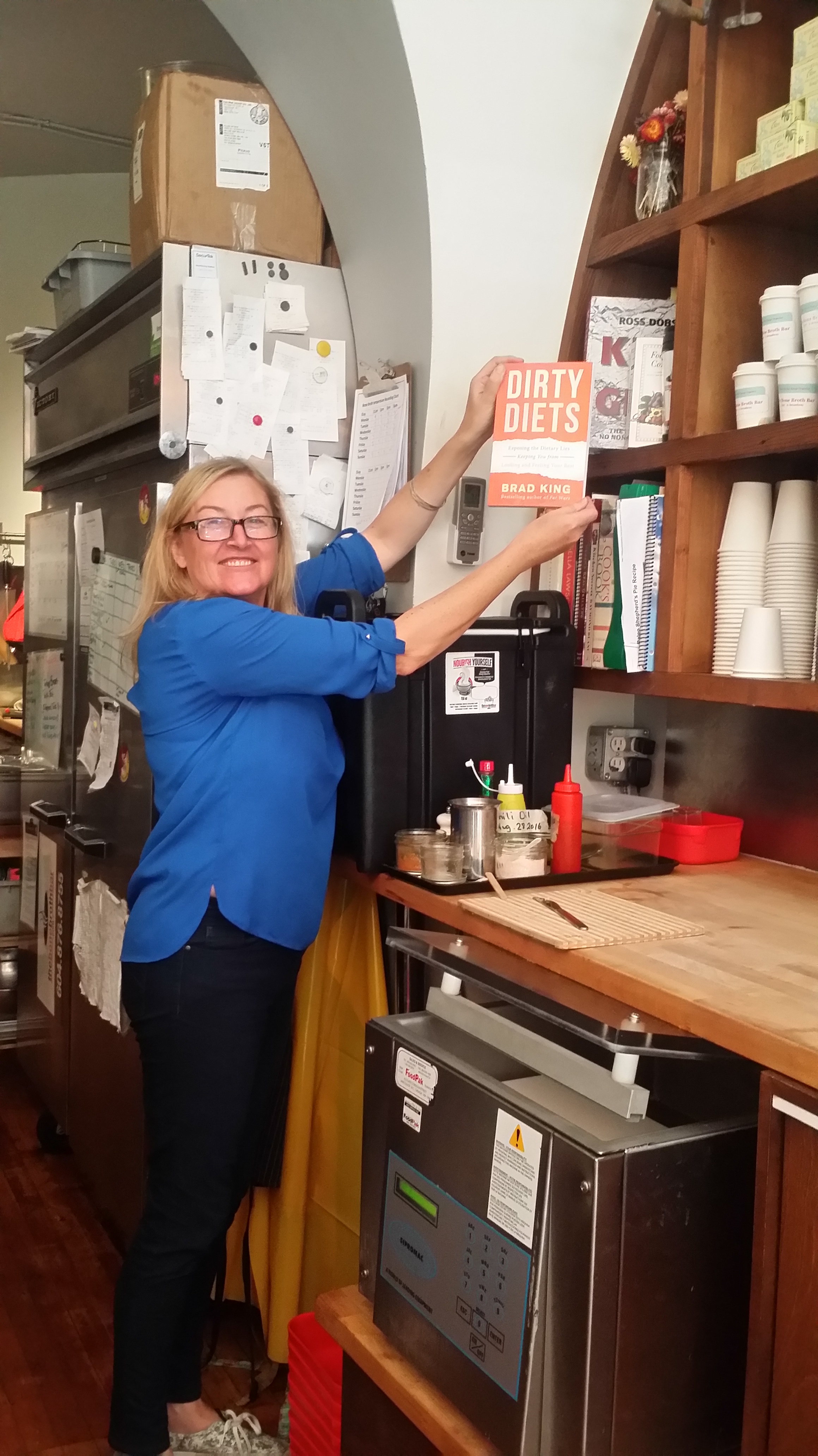 They have some good books. Jackie holds up Dirty Diets written by Brad King.